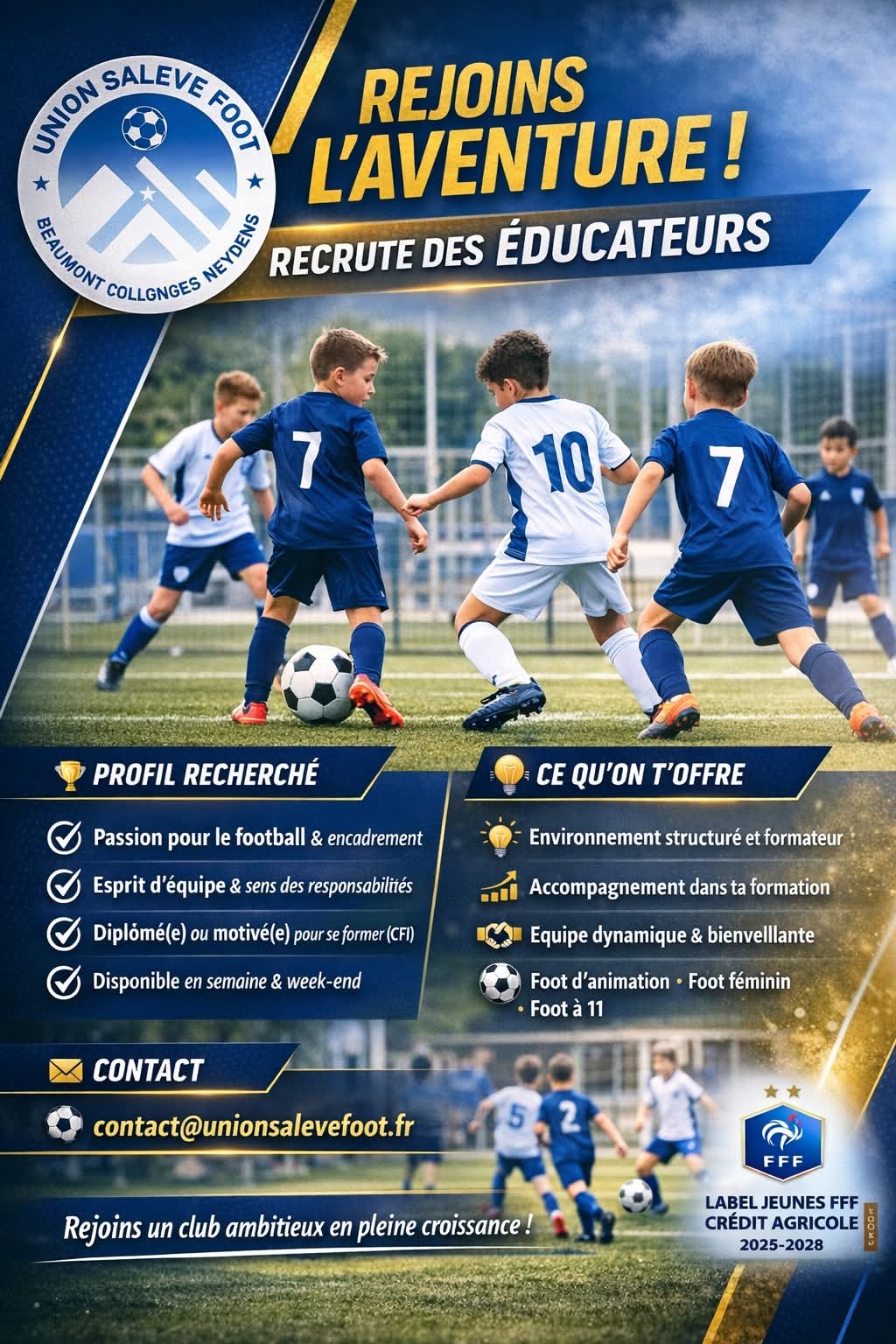 Pour tout renseignement, contactez notre directeur technique Bastien Aubry au 06 59 25 98 27 ou envoyez-nous un email à contact@unionsalevefoot.fr.